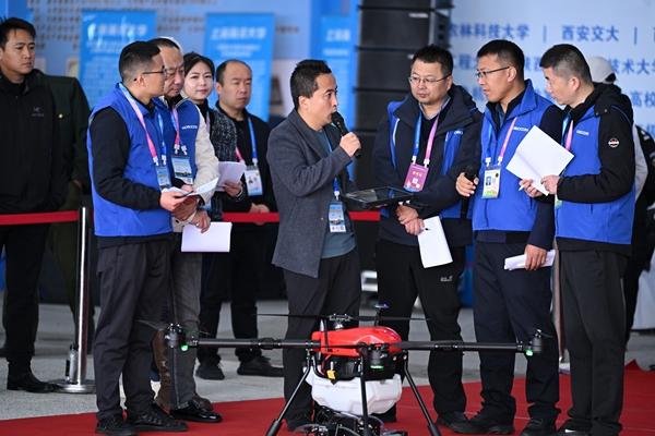 10月26日,在第32届杨凌农高会的农业机器人比赛上,技术人员(前中)向评委介绍参赛的农用无人机产品。近日,第32届中国杨凌农业高新科技成果博览会在陕西杨凌举行,集中展示农业机器人领域的最新成果。新华社记者 李一博/摄