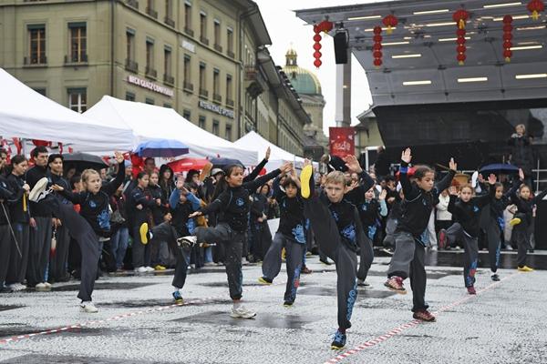 10月25日,在瑞士首都伯尔尼,表演者在“遇见中国”文化节上展示中国武术。为庆祝中国与瑞士建交75周年,“遇见中国”文化节25日在瑞士首都伯尔尼老城举行。当天下午,文化节现场上演中国武术、瑞士传统阿尔卑斯山号演奏等节目,吸引了众多当地民众。新华社记者 连漪/摄