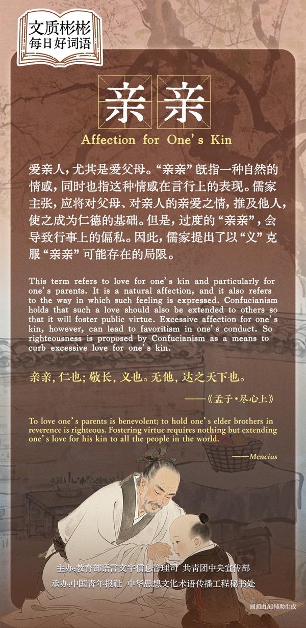 爱亲人,尤其是爱父母。“亲亲”既指一种自然的情感,同时也指这种情感在言行上的表现。儒家主张,应将对父母、对亲人的亲爱之情,推及他人,使之成为仁德的基础。但是,过度的“亲亲”,会导致行事上的偏私。因此,儒家提出了以“义”克服“亲亲”可能存在的局限。