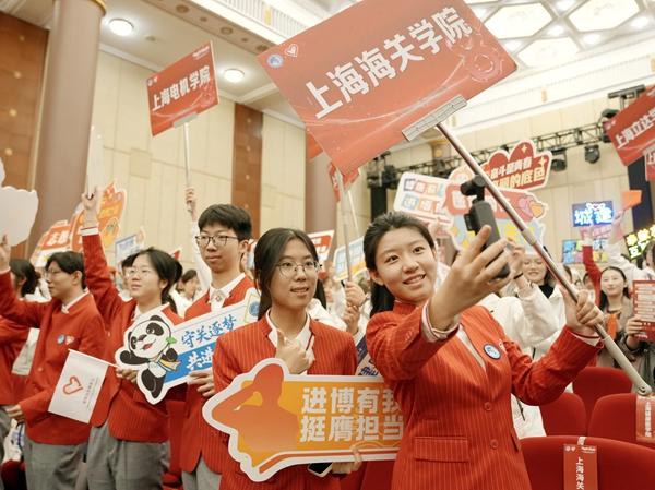 10月29日,志愿者在仪式开始前自拍留念。当日,第八届中国国际进口博览会志愿者上岗宣誓仪式在上海展览中心友谊会堂举行。志愿者将服务于现场引导咨询、展会注册管理、新闻宣传辅助、交易数据统计等岗位。据介绍,以往七届进博会累计吸引3.4万名志愿者参与服务。新华社记者 刘颖/摄