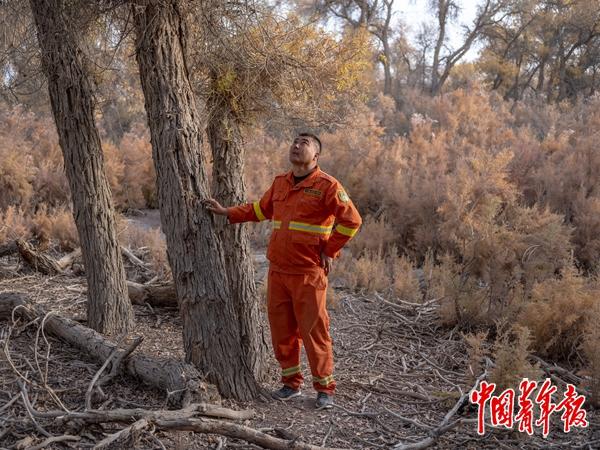 在塔里木河畔,护林员依布拉依木·阿合尼亚孜已坚守17年,日常负责天然林病虫害监测、森林草原防火巡查宣传、野生动植物保护救助及林草湿荒资源保护等工作。他回忆,20世纪90年代因过度放牧与河道改道,古河道的胡杨林因缺水而枯死,村民常砍伐枯木当柴火,春季沙尘暴会将天空染黄,让人看不清道路。2016年新疆启动塔里木河流域胡杨林拯救行动后,沙雅县开展系统性引洪补水。依布拉依木带领队员协助林草局清理淤积河道、修筑拦洪坝,确保每年八九月胡杨落种期关键供水。“水必须及时到位,否则新苗难以存活。”他介绍,通过疏通400余公里引洪渠与50多公里拦洪坝,胡杨林逐渐恢复生机,林下植被覆盖度显著提升,塔里木兔和白尾地鸦的“上镜率”也明显提高,生态修复更重塑了当地气候。