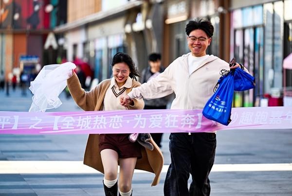 当日,由天津市和平区民政局主办的“悦动津城·美丽和平” 之 “全城热恋·为爱狂奔”婚纱趣跑嘉年华活动在和平区金街步行街举行,吸引了数十对情侣参加。新华社记者 赵子硕/摄