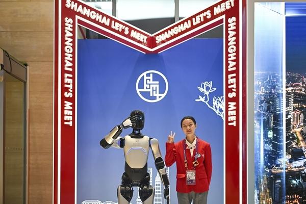 11月4日,志愿者(右)在第八届进博会新闻中心与“机器人志愿者”合影。