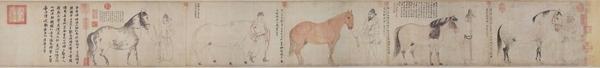 《五马图》技艺高超、传承有序,画上又有与李公麟同时代的黄庭坚的跋语,另有南宋初的曾纡跋,言及黄庭坚题于元祐五年(1090),因此,绝大多数人都认为《五马图》是李公麟的真迹。但也不是没有疑点,疑点之一就是画上的签题。依元代以来旧说,此画是李公麟和黄庭坚的“合作”,前者绘图,后者题记。前四匹马都有签题,独第五匹没有。但四段签题中竟有三种格式: