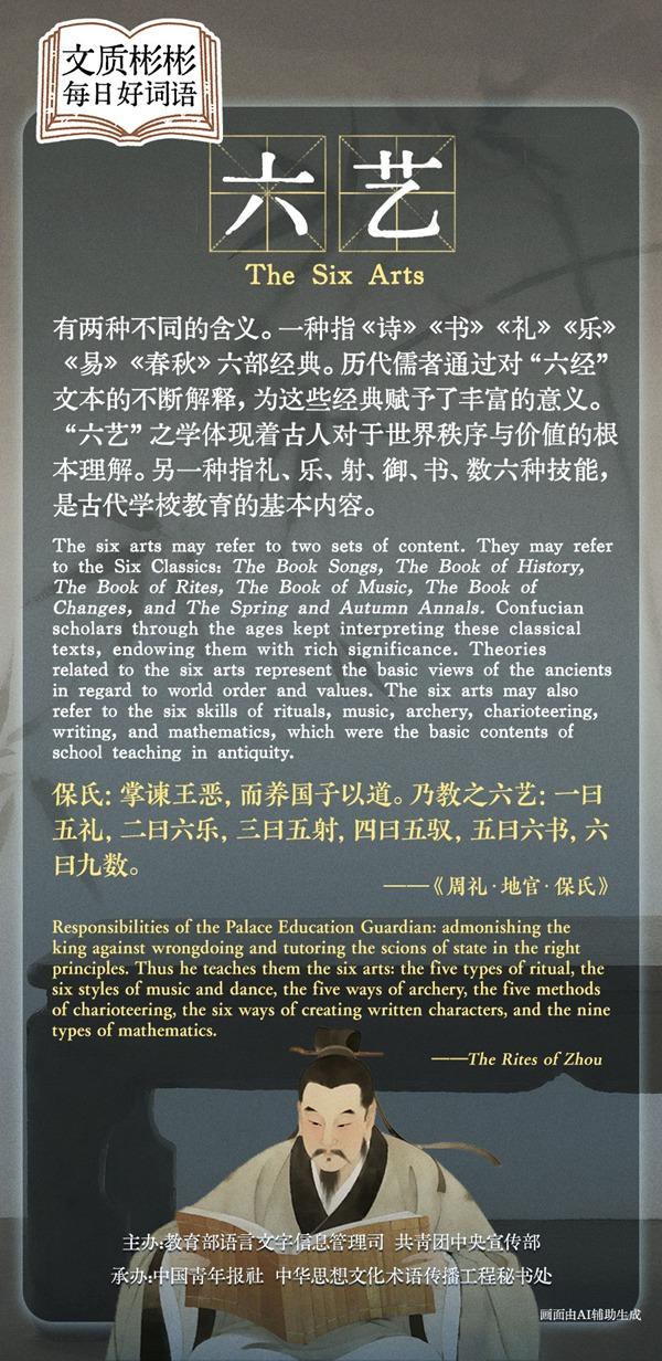 Responsibilities of the Palace Education Guardian: admonishing the king against wrongdoing and tutoring the scions of state in the right principles. Thus he teaches them the six arts: the five types of rituals, the six styles of music and dance, the five ways of archery, the five methods of charioteering, the six ways of creating written characters, and the nine types of mathematics. (The Rites of Zhou)