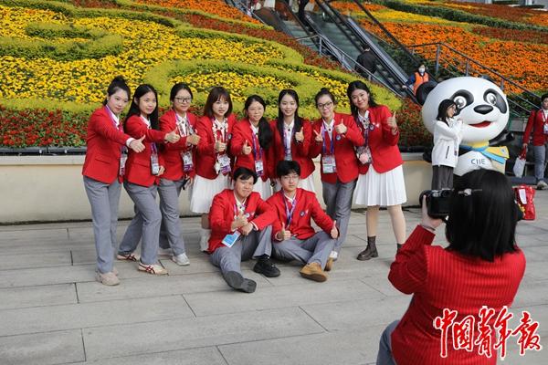 11月10日,上海国家会展中心,第八届中国国际进口博览会最后一天,志愿者合影留念。