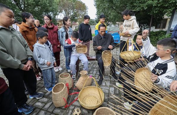11月12日,在长兴县泗安镇罗家地村的文化广场,学生们在竹编艺人的带领下学习竹编技艺。