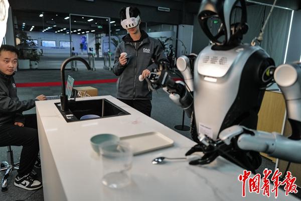 人群中,20岁的史轩煜熟练地戴上VR设备,抓起一旁的手柄遥控器,指挥机器人将一口炒锅放上燃气灶。