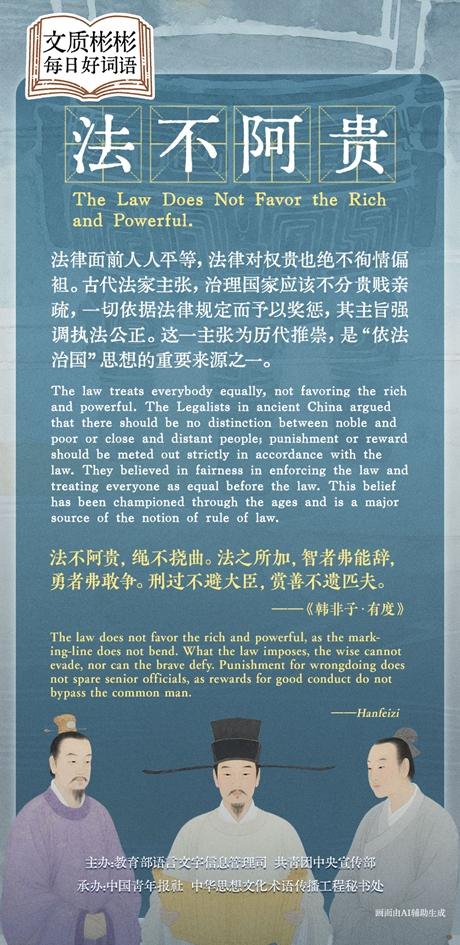 法律面前人人平等,法律对权贵也绝不徇情偏袒。古代法家主张,治理国家应该不分贵贱亲疏,一切依据法律规定而予以奖惩,其主旨强调执法公正。这一主张为历代推崇,是“依法治国”思想的重要来源之一。