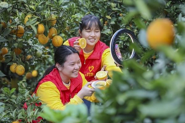 12月3日,福建省泉州市南安市金淘镇清华脐橙场内一派忙碌景象,志愿者化身“带货主播”,对着镜头向网友推介本地丰收的鲜甜脐橙。