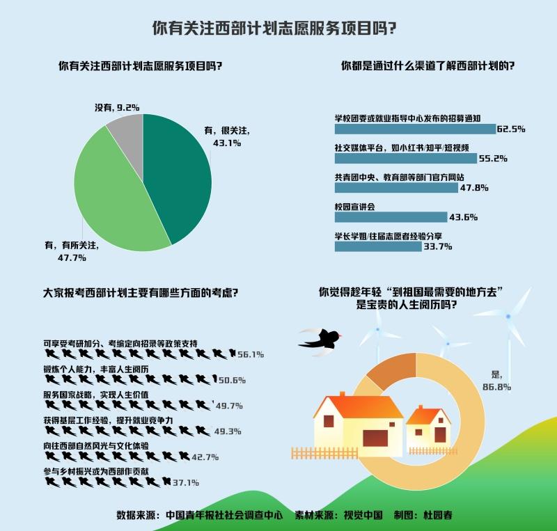 前不久,中国青年报社社会调查中心联合问卷网(wenjuan.com),就“西部计划”展开专题调查,共有2009名在校大学生参与。数据显示,90.8%的受访大学生关注西部计划志愿服务项目。86.8%的受访大学生认为,趁年轻“到祖国最需要的地方去”是宝贵的人生阅历。