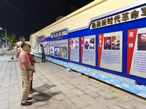 在广东省湛江市霞山区文明北一路,夜幕降临,蓝色夜光路灯会并排亮起,照亮路边的海军装备浮雕和英模事迹展板,吸引路过的市民们驻足围观。