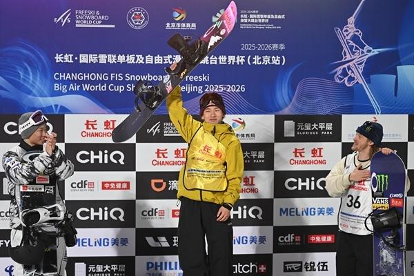 12月6日,2025-2026赛季国际雪联单板及自由式滑雪大跳台世界杯北京站单板滑雪大跳台男子组决赛在北京首钢滑雪大跳台举行。中国选手苏翊鸣以181.00分夺冠。图为苏翊鸣(中)登上领奖台。赵文宇/视觉中国