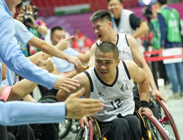 12月8日,辽宁队球员在比赛后接受祝贺。当日,在广州举行的全国第十二届残疾人运动会暨第九届特殊奥林匹克运动会轮椅篮球项目男子三人篮球金牌赛中,辽宁队13∶9战胜北京队,夺得金牌。