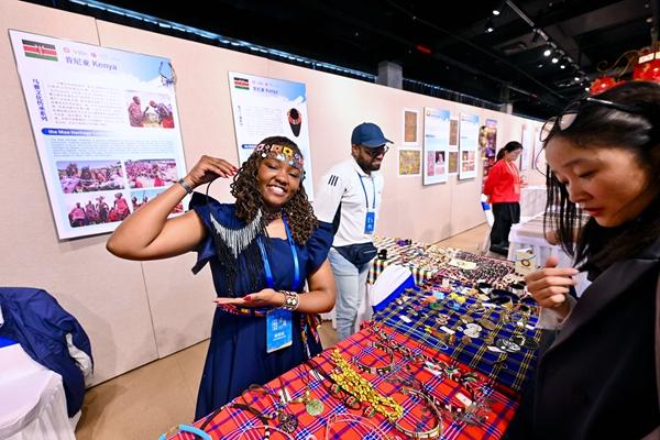 12月12日,肯尼亚参展代表在海上丝绸之路非物质文化遗产展演活动上展示传统饰品。当日,文明万象——海上丝绸之路非物质文化遗产展演活动在福建泉州非物质文化遗产馆举行,集中展示了各国各地区传统美术、传统技艺、传统舞蹈等代表性非遗项目,为公众呈现多彩非遗魅力。新华社记者 姜克红/摄