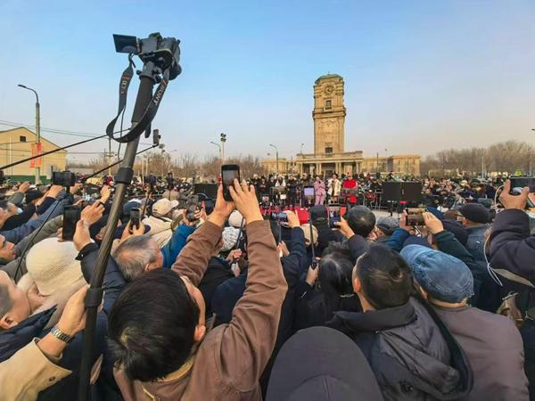 中国广播艺术团女高音周子淇穿着厚厚的羽绒服站到了市民中心一个小小的台子上,这大概是她站上过的最简陋的舞台,但当伴奏响起,《我爱你中国》的歌声穿透了冬日清冷的空气,直抵人心。
