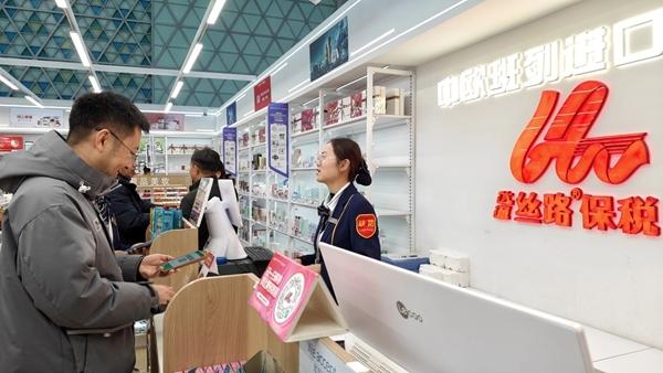 银川火车站中欧班列进口商品(保税)店依托中欧班列回程车的物流运输优势,将中欧班列沿线国家和地区的优质特色商品进口到国内,采用一般贸易和跨境保税相互融合的交易方式,让广大旅客享受到“一带一路”倡议的普惠福利。新华社记者 邢广利/摄