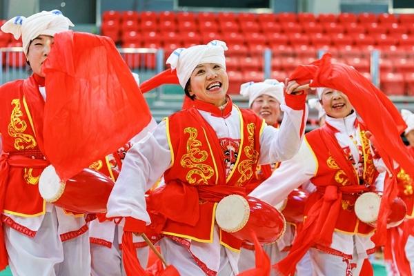 当日,新疆乌鲁木齐经济技术开发区(头屯河区)在文体中心举行第二届“打起手鼓舞起龙”社火集中彩排活动。孙振嵩/摄(视觉中国供图)
