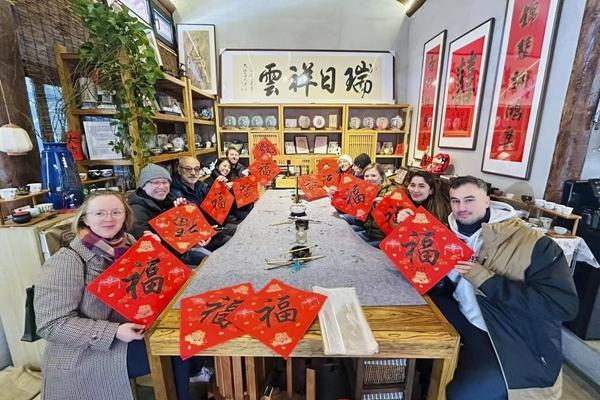 2025年12月,入境旅游策划师孙姝俐团队带领外国游客在北京大栅栏街区体验中国书法。