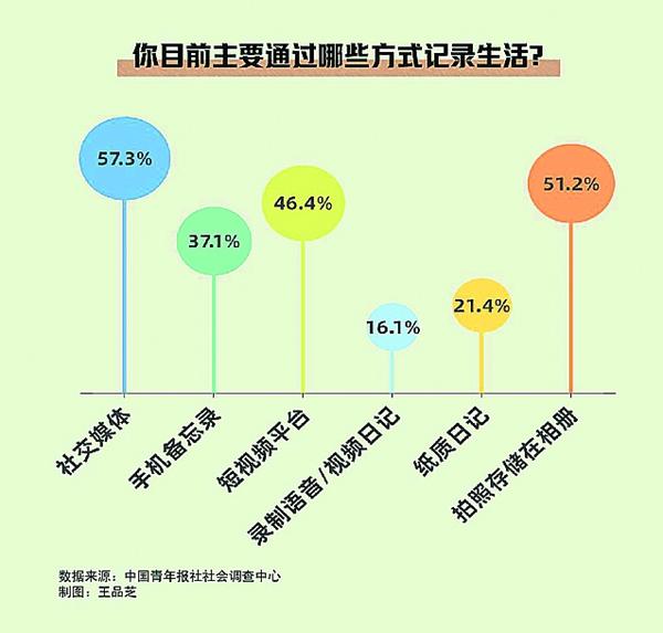大家主要通过哪些方式记录生活?调查中,排在前几位的是社交媒体发布(57.3%)、拍照但仅存储在相册(51.2%)、在短视频平台发布(46.4%)等,其他还有:手机备忘录(37.1%)、纸质日记(21.4%)、录制语音/视频日记(16.1%)、博客(5.0%)等。