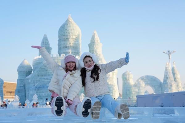1月5日,游客在哈尔滨冰雪大世界园区拍照。