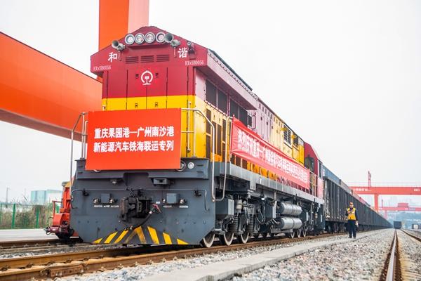 1月7日,铁海联运“重庆造”新能源汽车专列在重庆果园港鱼嘴站等待发车。当日,一列满载108台“重庆造”新能源汽车的铁海联运专列,从重庆果园港鱼嘴站发出,预计在48小时后抵达广州南沙港,随后换装海轮运往中东市场。此趟专列是2026年首趟铁海联运“重庆造”新能源汽车专列,也是自2025年12月底渝穗两地“新能源汽车铁海联运海事监管互认试点”正式启动以来进行的首批规模化运输业务。新华社记者 唐奕/摄