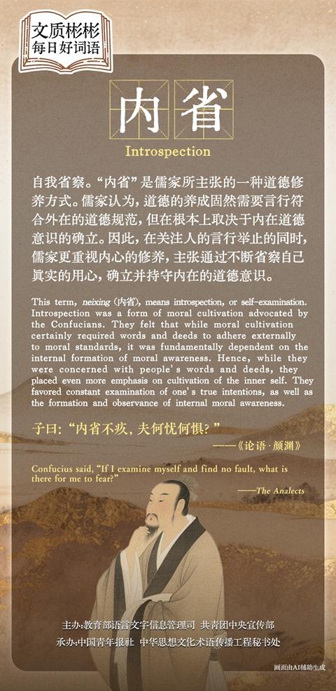 自我省察。“内省”是儒家所主张的一种道德修养方式。儒家认为,道德的养成固然需要言行符合外在的道德规范,但在根本上取决于内在道德意识的确立。因此,在关注人的言行举止的同时,儒家更重视内心的修养,主张通过不断省察自己真实的用心,确立并持守内在的道德意识。