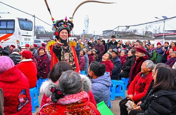 1月7日,四川眉山,文艺工作人员在仁寿县怀仁街道黑虎社区与群众互动。连日来,四川省眉山市仁寿县组织文化惠民大篷车,到乡镇、社区、企业等地,开展形式多样的“文化下乡”惠民活动,把优质文化产品和服务送到群众身边,让群众在家门口乐享“文化大餐”。视觉中国供图