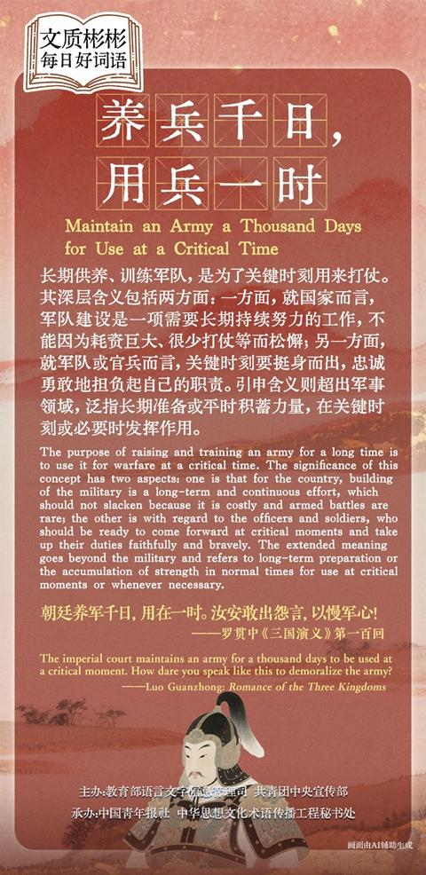 The imperial court maintains an army for a thousand days to be used at a critical moment. How dare you speak like this to demoralize the army? (Luo Guanzhong: Romance of the Three Kingdoms)