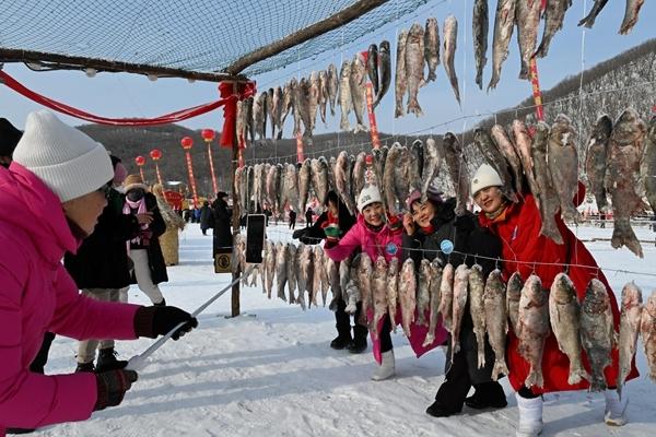 当日,黑龙江省牡丹江市在镜泊湖举行冬捕节,吸引了众多游客前来观赏。镜泊湖是我国最大的高山堰塞湖,这里生态环境优越、渔业资源丰富,孕育了源远流长的渔猎文化。镜泊湖冬捕节已持续开展多年。李学斌/摄(新华社发)