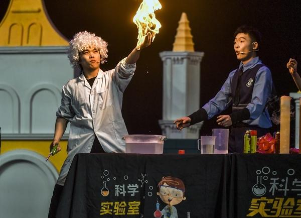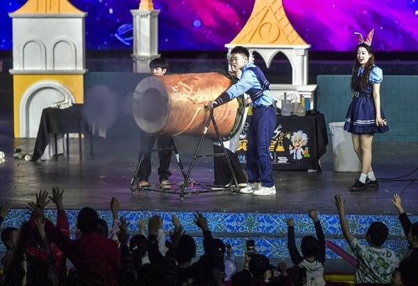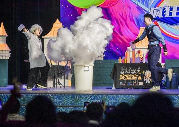 1月10日晚,新疆乌鲁木齐市,沉浸式儿童剧——互动科学秀《疯狂实验室》在新疆人民剧场演出,悬浮沙滩球、掌中火焰、空气炮、静电飞花等环节,将经典的物理、化学知识搬上舞台,让孩子们在互动中感受科学的魅力。视觉中国供图