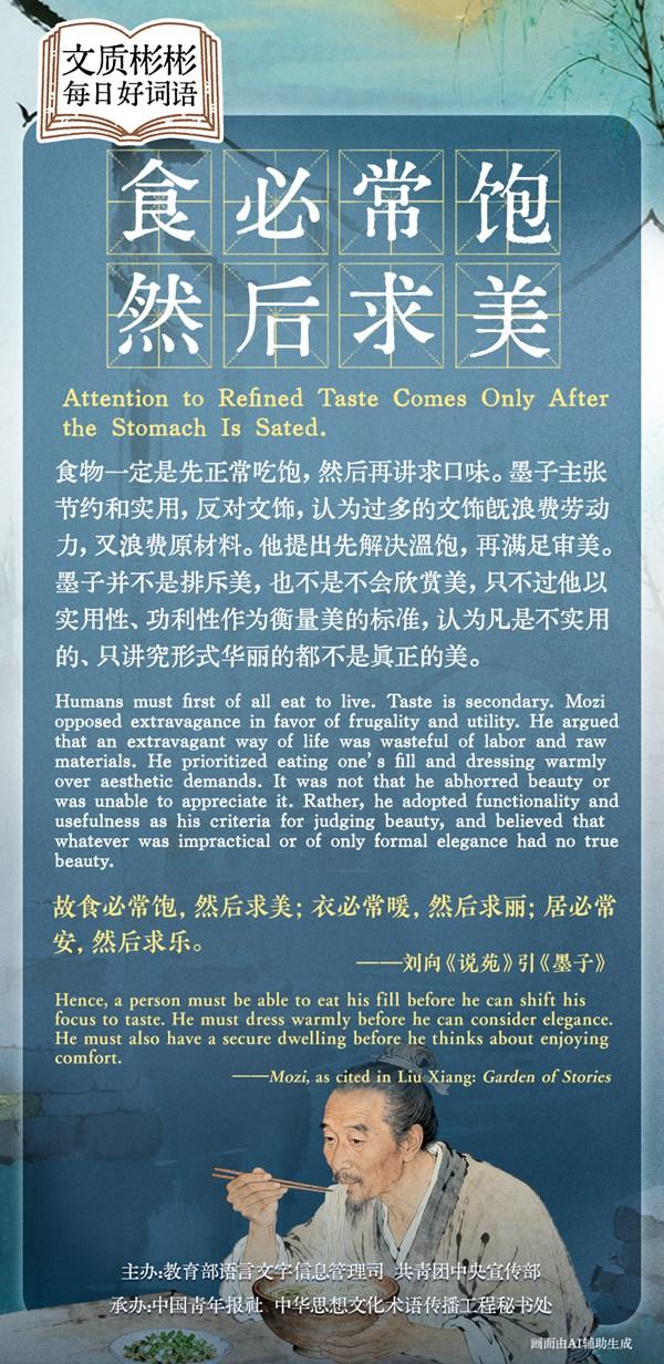 食物一定是先正常吃饱,然后再讲求口味。墨子主张节约和实用,反对文饰,认为过多的文饰既浪费劳动力,又浪费原材料。他提出先解决温饱,再满足审美。墨子并不是排斥美,也不是不会欣赏美,只不过他以实用性、功利性作为衡量美的标准,认为凡是不实用的、只讲究形式华丽的都不是真正的美。