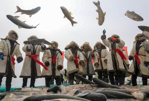 当日,新疆巴音郭楞蒙古自治州博湖县境内的博斯腾湖大河口景区举行巨网冬捕活动,吸引各地游客前来观赏。年磊/摄(新华社发)
