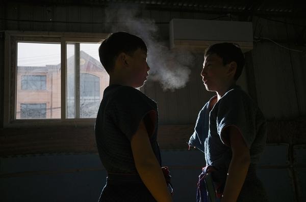 这座由村里闲置废旧厂房改造而成的摔跤武馆,没有精致的装潢,只有一间简易的训练馆和一片开阔的荒野空地。空地上整齐地摆放着杠铃、花砖、水缸、石锁等训练器材,一旁还有一排旧课桌。目前在这里学习的37个孩子,年纪最小的5岁,最大的18岁,大都还在上学。孩子们周一至周五放学后在旧课桌上写完作业,再一起练上约莫两小时。周末则是上午练体能和力量,下午学习摔跤技巧。推花砖、举杠铃、甩石锁、蛙跳、鸭子步……寒冬中,孩子们攥紧拳头,跟着口号的节奏咬牙坚持,脸蛋冻得通红,眼神却亮得像星星。