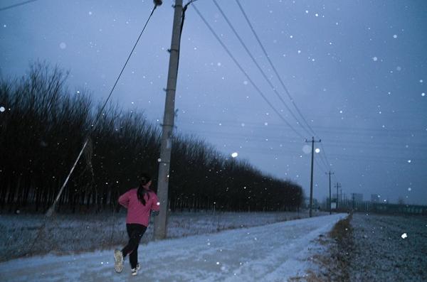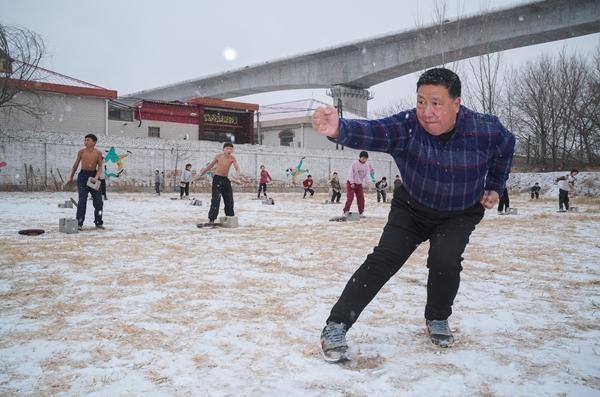 这样的越野跑是白鹤江13年前成立这家中国式摔跤武馆时就定下的训练课目。不论四季,每周一次。孩子们按年龄分组,分别跑4-8公里不等,为的是训练肺活量和耐力,为良好的身体打下“地基”。从庄稼地旁的土路到宽阔的柏油马路,孩子们奔跑的路线跨越乡村与城市,正在修建的雄忻高铁紧邻,不远处是近几年新出现的产业园高楼。