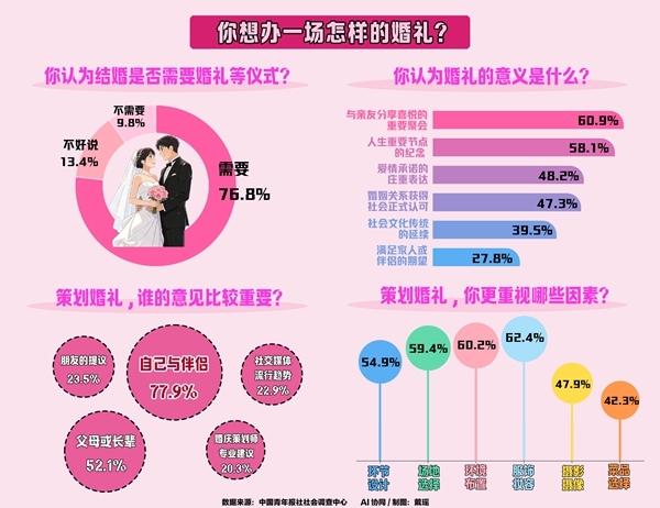 爱情的承诺、亲友的见证、人生重要时刻的纪念……一场浪漫婚礼,为新人创造了一份难忘的回忆。近日,中国青年报社社会调查中心联合问卷网(wenjuan.com)发布的一项有1333人参与的调查显示,76.8%的受访者认为结婚需要婚礼等仪式。服饰与妆容、环境布置、场地选择是受访者筹备婚礼时考虑较多的因素。