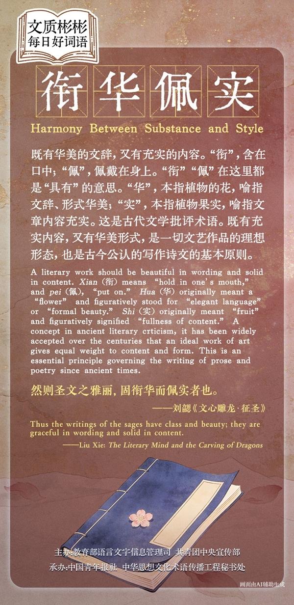 A literary work should be beautiful in wording and solid in content. Xian means "hold in one's mouth", and pei means "put on". Hua originally meant a "flower" and figuratively stood for "elegant language" or "formal beauty". Shi originally meant "fruit" and figuratively signified "fullness of content". A concept in ancient literary criticism, it has been widely accepted over the centuries that an ideal work of art gives equal weight to content and form. This is an essential principle governing the writing of prose and poetry since ancient times.