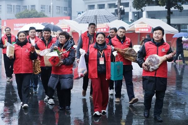 1月30日,淳安县的基层干部和新农人在农品市集现场拿着各自的农特产品向杭州市民推介。当日,“千岛好水润农品·书记领航共富路”书记进城卖山货暨千岛农品市集系列活动在杭州拱墅区运河广场启动,现场汇集来自浙江省杭州市淳安县的百余种山货。新华社记者 徐昱/摄