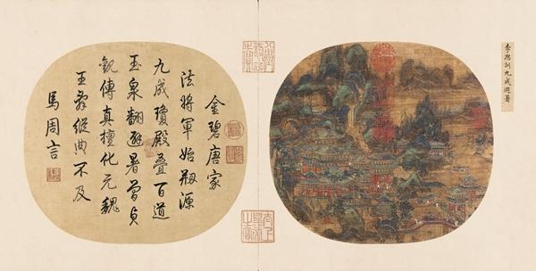 故宫博物院现存数幅传为唐代绘画的作品《宫苑图卷》《京畿瑞雪图纨扇》《九成避暑图》等,均是以大量宫观、人物为主体,附以山水树石,类似的作品图像也可在唐代早期敦煌壁画中找到。