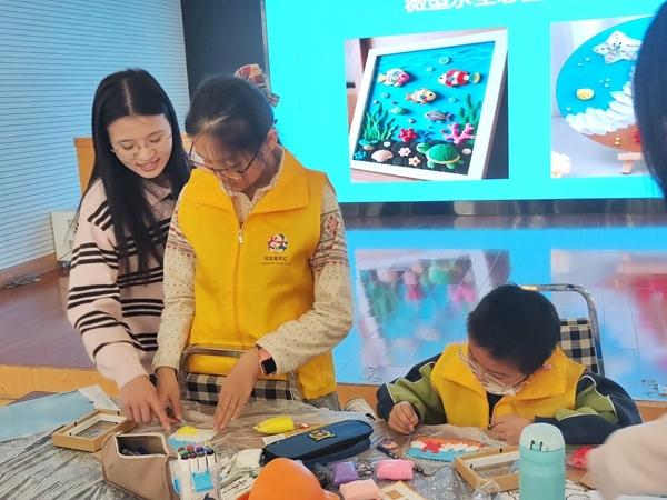 图为北京市东城区北新桥街道海巢HOT·社区青年汇2026年寒假红领巾成长营期间,志愿者在教孩子们制作生态画。北新桥街道团工委供图