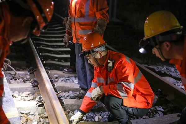 春运期间,在中国铁路南昌局集团有限公司厦门工务段泉州线路车间泉州综合维修工区,工长田兴旺带领着工友们坚守岗位,保障杭深铁路运行畅通无阻。图为田兴旺在泉州站内换长轨施工中,进行钢轨拉伸量测量作业。陈欢欢/摄
