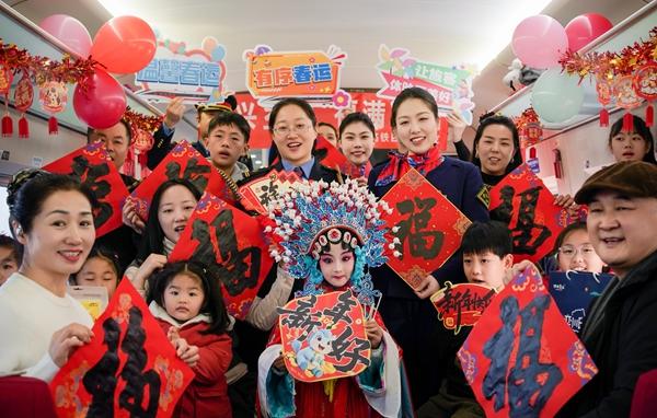 2月2日,郑州东至厦门G2045次列车上,“振兴乡村,福满车厢”主题活动正在进行。当日,2026年春运大幕正式拉开,全国527个火车站的7014个志愿服务岗(点)开启了春运第一天的志愿服务。