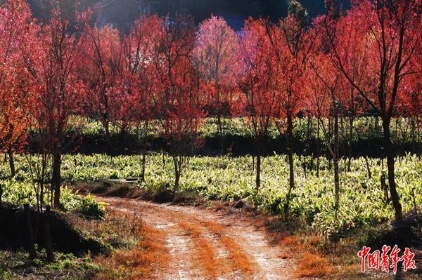 自从在甸中村建立基地之后,罗季杰再也没有离开过甸中村,多年来,他与团队培育出滇鹤红樱的4个品种,建成130亩物种资源圃及近600亩樱花基地,让安宁成为滇鹤红樱的“第二故乡”。每年冬季,甸中村山野遍染绯红,宛如一场樱花盛宴。在昆明市园林科学研究所、昆明市林业种苗管理站的支持下,滇鹤红樱被推荐为云南省新优特色乡土绿化植物,成为多地城镇绿化的“新宠”。