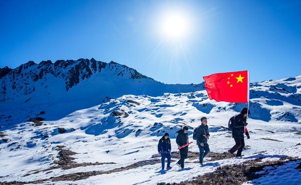 冬日时节,玉麦乡的群山覆盖着积雪。4名护边员晨光中行进在雪山间,50岁的普布罗布肩扛国旗,走在队伍最前面。