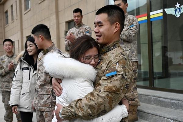 车子驶入一处山谷,两侧雪山屹立相迎,欢迎的锣鼓声传来。经过60多个小时的奔波,黄歆终于在营区门口见到了那个熟悉的身影。蒙明涛心有千言万语,最后化作一句暖心的问候:“老婆,辛苦了!”官兵的喝彩声中,两人紧紧相拥。