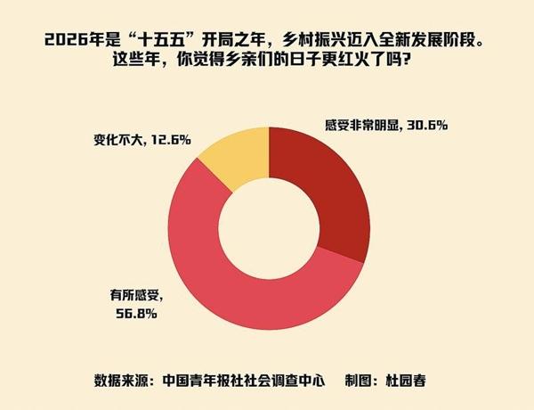 2026年是“十五五”开局之年,乡村振兴迈入全新发展阶段。调查显示,这些年,87.4%的受访者觉得乡亲们的日子更红火了,其中30.6%感受非常明显。
