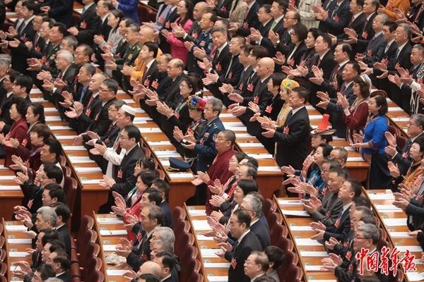 3月4日,北京,人民大会堂,全国政协十四届四次会议开幕会上,委员们在鼓掌。中青报·中青网记者 陈剑/摄