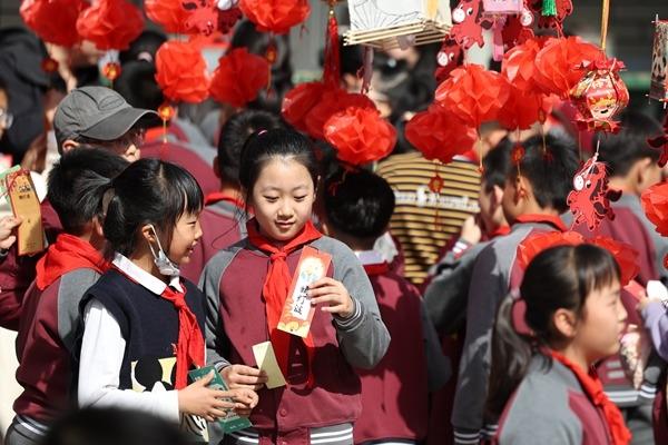 3月3日,甘肃省兰州市东郊学校的学生在校园元宵节民俗活动上猜灯谜。新华社记者 陈斌/摄