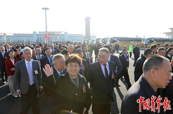 3月11日上午,北京人民大会堂外,全国政协十四届四次会议闭幕会开始前,委员们走向会场。中青报·中青网记者 陈剑/摄