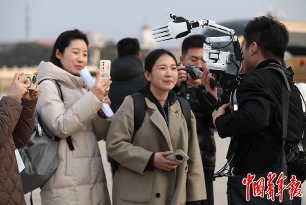 3月7日,北京人民大会堂外,全国政协十四届四次会议第二次全体会议结束后,一位参加两会报道的记者(右)正在向同行展示一款能够通过语音指令自动抓握相机的“灵巧手”机械臂。中青报·中青网记者 陈剑/摄